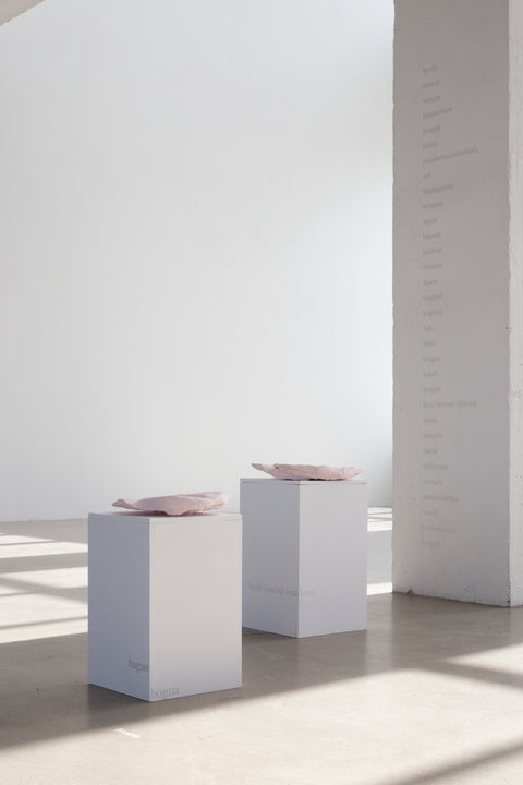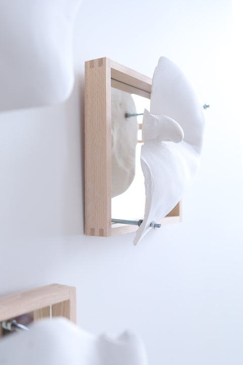 Casts of different parts of the artist’s body mounted on art wood panels that are mass produced and rectangular. The organic shapes and forms of the body against the massproduced rectangle shows the often rigid and unwritten ‘rules’ and boxes in our society. Orientation, race, sexuality, look etc. The mirrors reveal the backside of the sculpture that is imperfect and rough, which represents the complex thoughts, feelings and history of each person while mirroring the viewer in the piece.